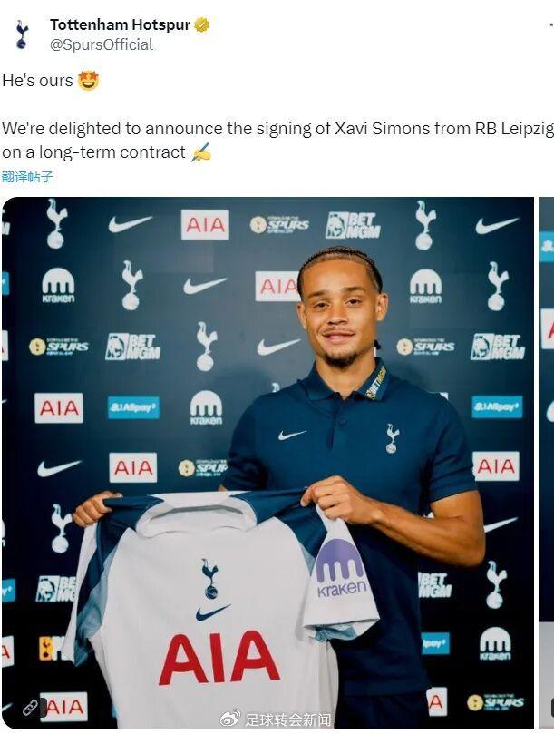官方:热刺宣布从莱比锡红牛签下了哈维-西蒙斯。