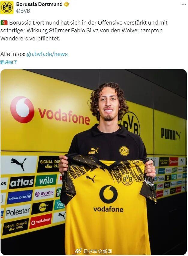 官方:多特蒙德宣布从狼队签下了法比奥-席尔瓦,这名23岁的前锋签下了一份5年合同。