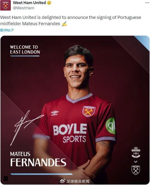 官方:西汉姆宣布从南安普顿签下了马特乌斯-费尔南德斯,这名21岁的后腰签下了一份5年合同。