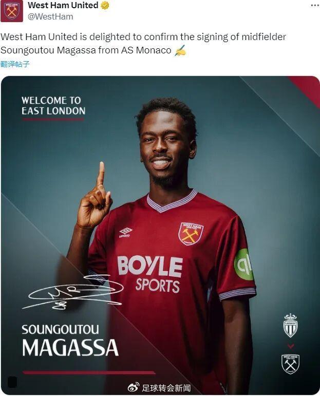 官方:西汉姆宣布从摩纳哥签下了松古图-马加萨,双方签下了一份长期合同。